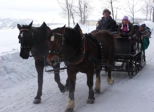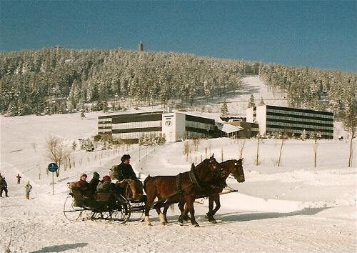 Ausfahrt mit dem Pferdeschlitten vorbei am "Appartementhotel Jens Weißflog"/Oberwiesenthal